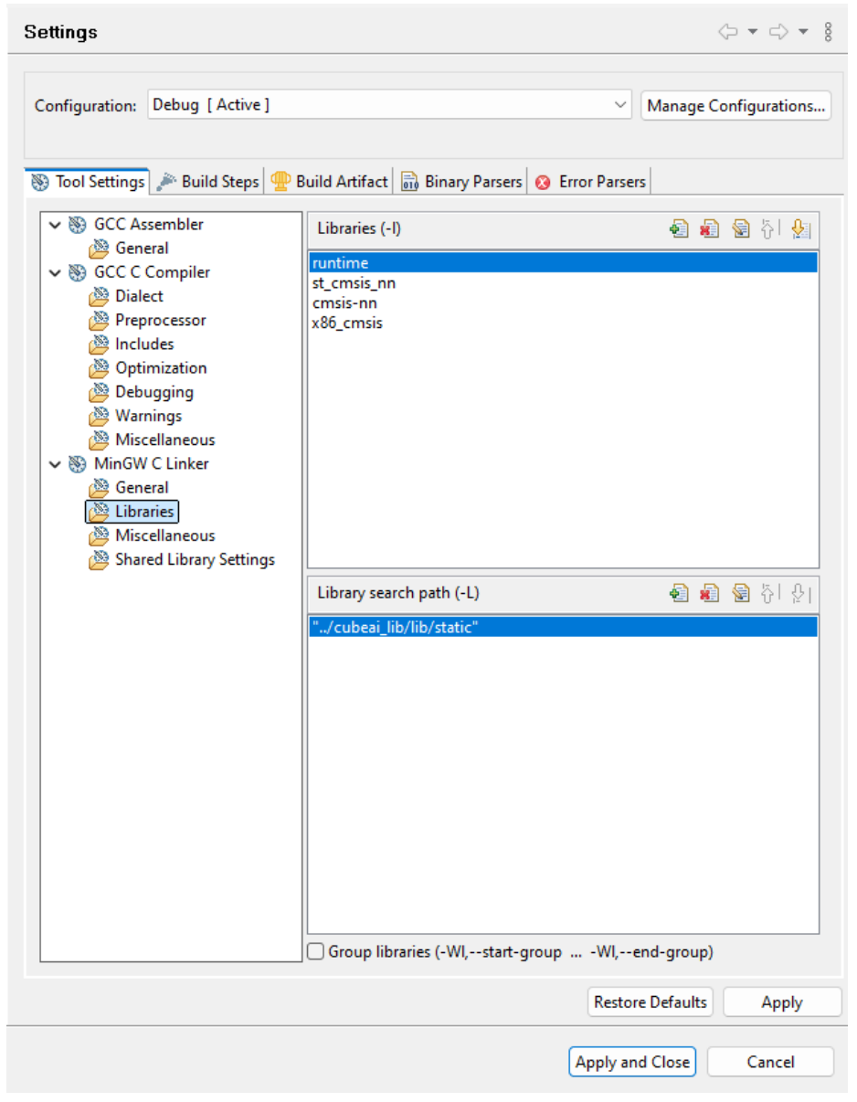我们还需要链接 X-Cube-AI 的静态库如下,包括库的路径"../cubeai_lib/lib/static",以及库的名字:runtime,st_cmsis_nn,cmsis-nn,x86_cmsis,如下图 9 所示。