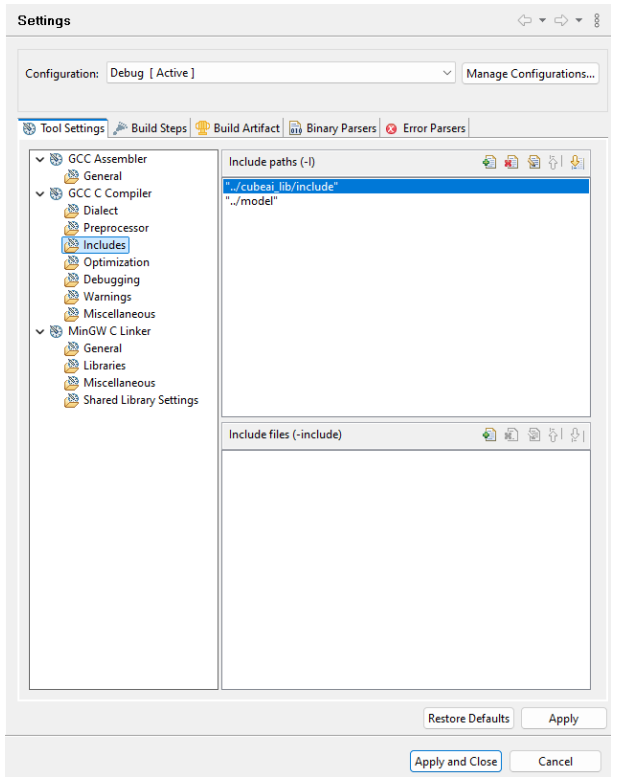 然后,加入 cubeai_lib 中的 include 和 model 路径,也就是"../cubeai_lib/include"和 "../model",如下图 8 所示。这是为了包含编译时需要的头文件。