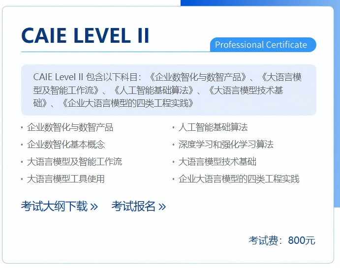 ②专业背景无限制:不设专业报考门槛,适合各背景人士学习。认证体系包含两个级别:Level I注重基础认知和工具应用,包含《人工智能认知基础与规范》、《Prompt进阶技术》、《人工智能商业应用》等实用内容;Level II侧重技术实现和企业解决方案,包括《大语言模型及智能工作流》、《企业大语言模型的四类工程实践》等深度课程。