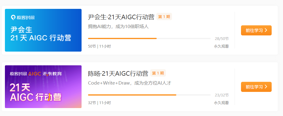 极客时间非常会瞄准我这类人的心理,AI训练营2000多一期的搞了好几期,一期没落下,如下: