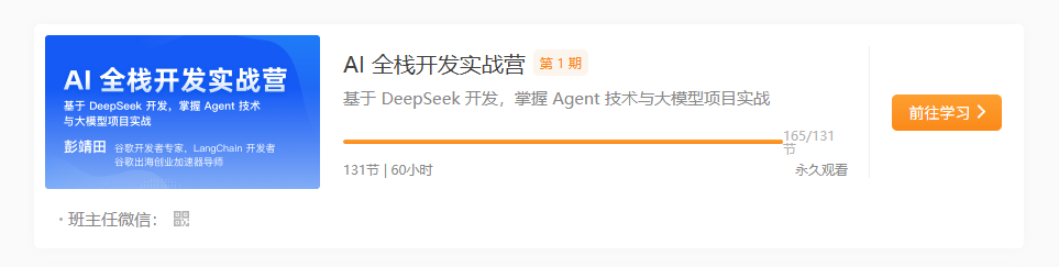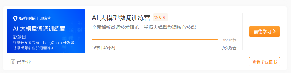 其实我还是学的挺认真的,把所有的课程都看了,除了头两章,还有讲国内大模型的几章看不太懂以外,其他的基本上切瓜砍菜,之前的开发实战营,微调实战营,agent实战营中都学过了,还有平时自己早就也研究过dify,fastgpt,mcp,ai ide这些东西,所以难度真是不大,老师发调研说课程咋样,我说感觉太简单了,老师答曰这是初中级课程,难度就是如此,诚不欺我啊,不过估计这也是我在极客时间上最后报的彭靖田老师的AI行动营了,确实是学了四期,药效不断降低,可能也是我自身的抗药性提高了,在此结营之际,完成训练营最后一篇作业,致我极客时间的各种AI营学习时光!
