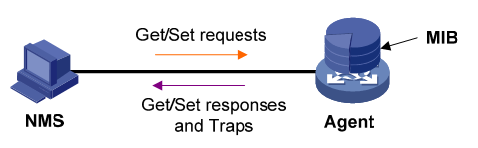 任何一个被管理的资源都表示成一个对象,称为被管理的对象。MIB是被管理对象的集合。它定义了被管理对象的一系列属性:对象的名称、对象的访问权限和对象的数据类型等。每个SNMP设备(Agent)都有自己的MIB。MIB也可以看作是NMS(网络管理系统,网络管理系统既可以指一台专门用来进行网络管理的服务器,也可以指某个网络设备中执行管理功能的一个应用程序)和Agent之间的沟通桥梁。它们之间的关系如图1所示。