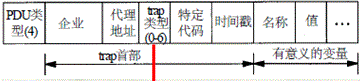 差错索引(error index) 当出现noSuchName、badValue或readOnly的差错时,由代理进程在回答时设置的一个整数,它指明有差错的变量在变量列表中的偏移。 (3)trap首部