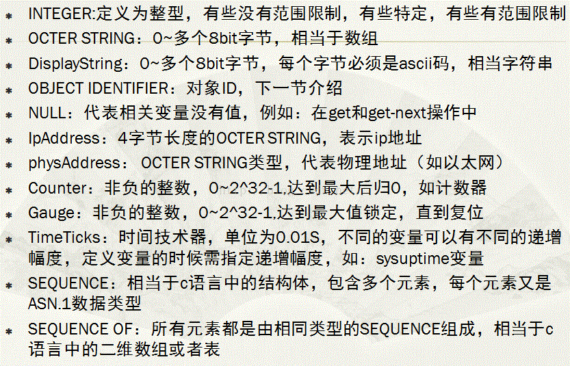SMI定义了SNMP框架所用信息的组织、组成和标识,它还为描述MIB对象和描述协议怎样交换信息奠定了基础。