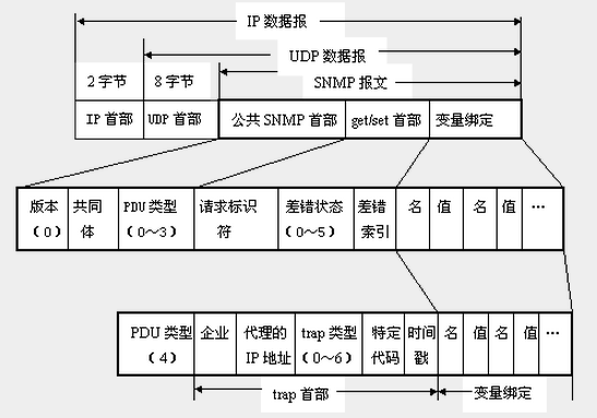 下图是封装成UDP数据报的5种操作的SNMP报文格式。可见一个SNMP报文共有三个部分组成,即公共SNMP首部、get/set首部、trap首部、变量绑定。