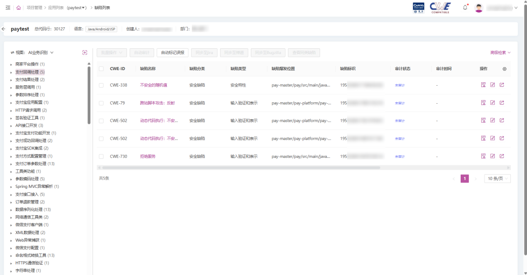 系统引入AI驱动的业务识别模型,能够自动识别缺陷所属的业务模块(如支付、登录认证、数据导出、权限控制等)。基于识别结果,系统可将缺陷按业务维度进行归类,帮助开发人员快速定位与其负责模块相关的安全与质量风险。