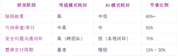在日常开发过程中,开发者在提交代码前即可实时获取AI生成的安全合规性评估和缺陷修复方案,显著降低因安全疏漏导致或编码不规范产生的漏洞缺陷。有效提升了代码审查效率,缩短了从发现问题到修复问题的闭环周期,助力研发团队实现“安全左移”与“质量内建”。平均缩短单个功能模块的研发周期 15%-30%。