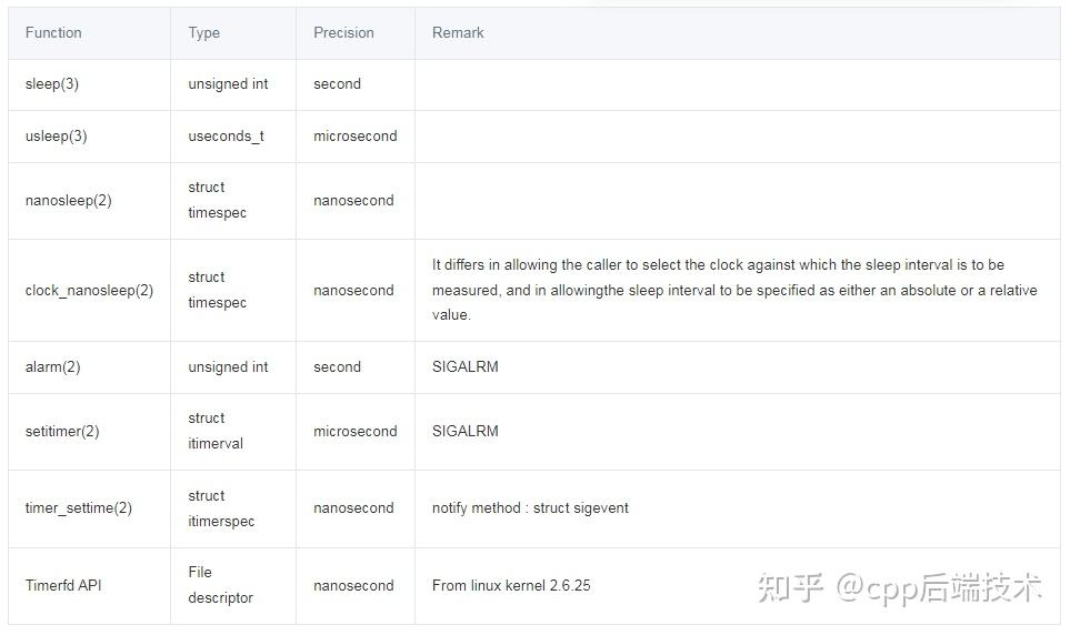 要想使用上面那样的定时器功能,我们必须利用Linux上现有的定时通知函数,封装一个定时器。Linux上的定时通知函数五花八门,要封装我们自己的定时器,首先需要选用一个定时通知的函数。查阅资料整理出了Linux上所有的定时函数,如下表: