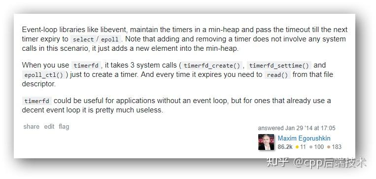 开篇的表格里有提到,从Linux2.6.25开始,timerfd系列API,带来了一种全新的定时机制。把超时事件转换为了文件描述符,当超时发生后该文件描述符会变成可读。于是超时事件就变成了普通的IO事件。如果未对timerfd设置阻塞,对其read操作会一直阻塞到超时发生。此外timerfd的精度达到了纳秒级。不考虑跨平台等因素,这是一个非常不错的选择。