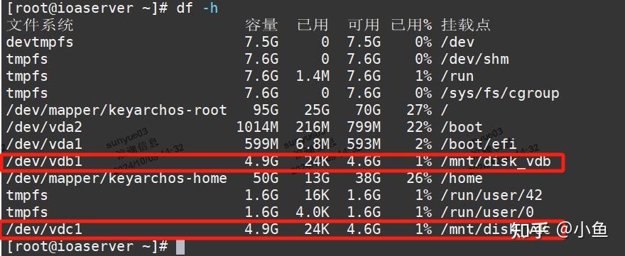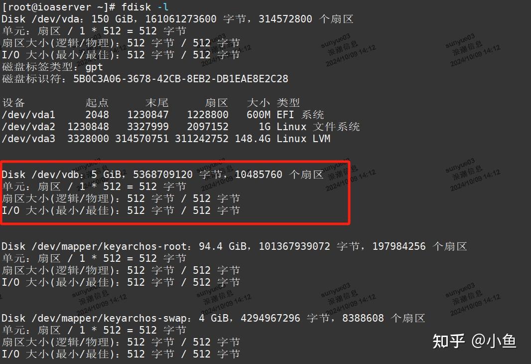 执行fdisk -l查看磁盘信息,/dev/vdb为我们新加的磁盘