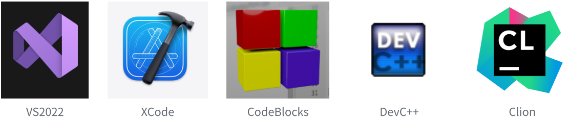 常见的编译器有msvc、clang、gcc,当然也有一些集成开发环境,如VS2022、XCode、Code Blocks、DevC++、Clion等。