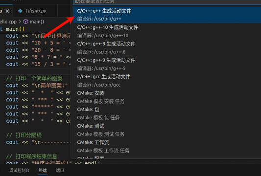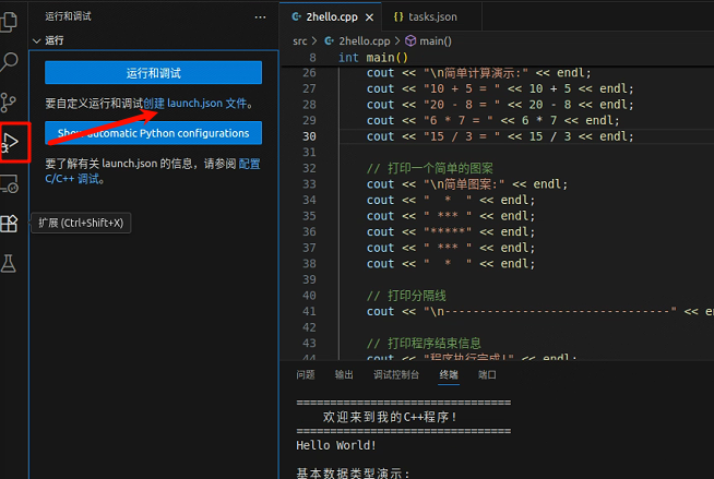 而如果是你自己新建的目录现在是没有tasks.json文件的,这个文件是用来控制生成文件的目录,也就是他其实就是前面g++ 2.hello.cpp -o main这条命令,那为什么不再终端中写程序,反而要在tasks.json中敲这条命令呢?