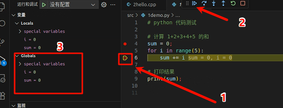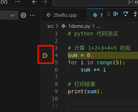 选择python后就会卡在了你的小红点处,我在for循环点击了一个小红点,然后就可以分步调试我的程序了