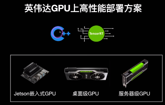 硬件适配方案: 在英伟达GPU上实现高性能部署首选C++结合TensorRT的方案,适用于Jetson系列嵌入式GPU、桌面级GPU和服务器级GPU