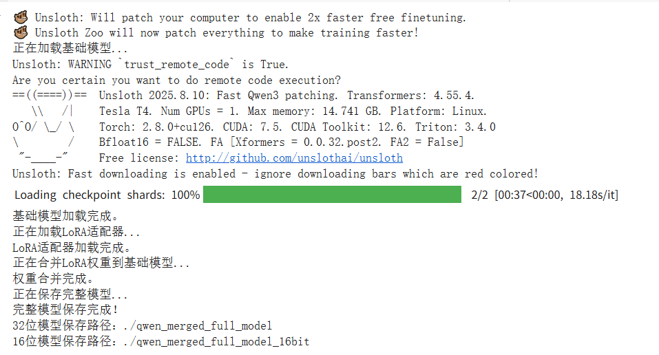 使用qwen3:4B 16 位精度大模型进行微调,模型大小约为8G,最后保存模型位16位和32位