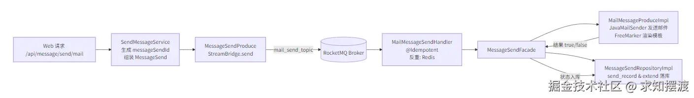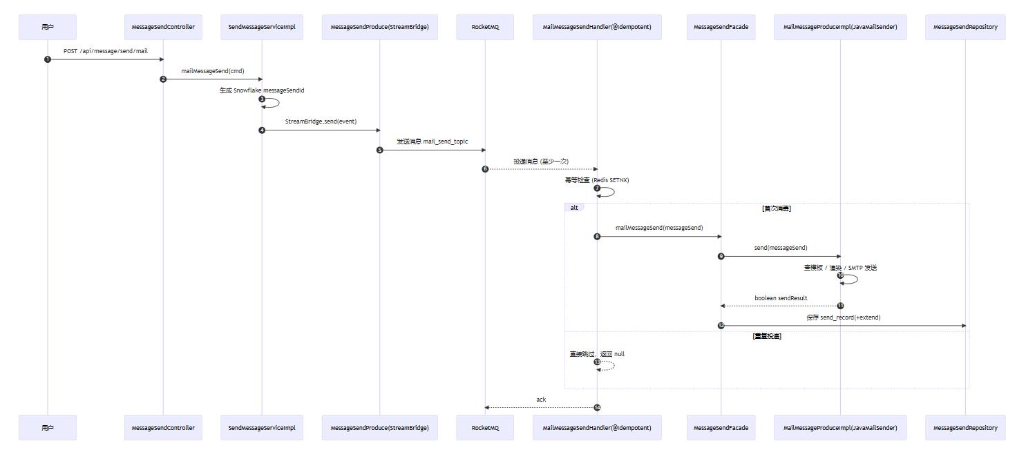 - Web 接口入参校验 → 发送 MailMessageSendEvent 到 RocketMQ → 消费者落库并真正调用邮件网关(QQ 邮箱)。