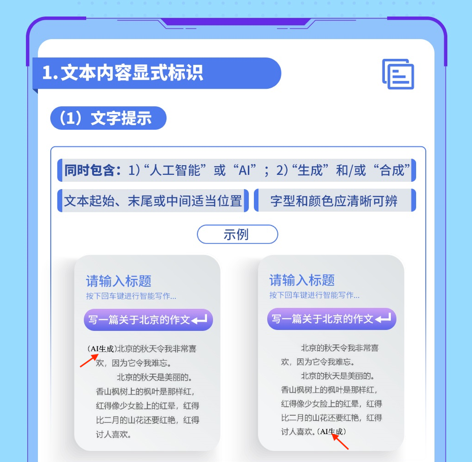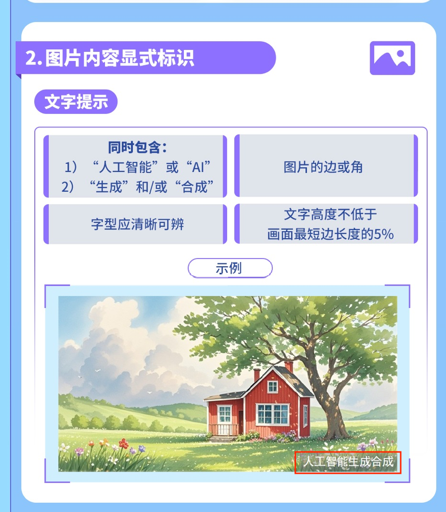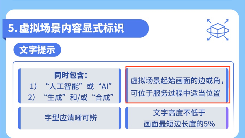 • 显式标识:必须在内容或交互界面显著位置提示“本内容/本场景由AI生成”。