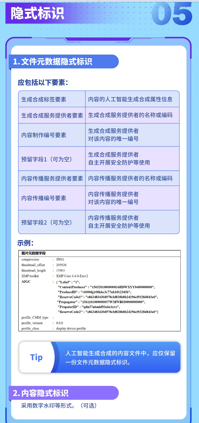 • 隐式标识:在文件元数据写入“生成属性、服务者统一编码、内容编号”等字段,鼓励使用数字水印。