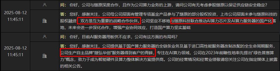 2023年11月子公司中标甘肃电信庆阳节点智算中心硬件设备项目;2024年9月投资者互动中表示正推进项目建设。