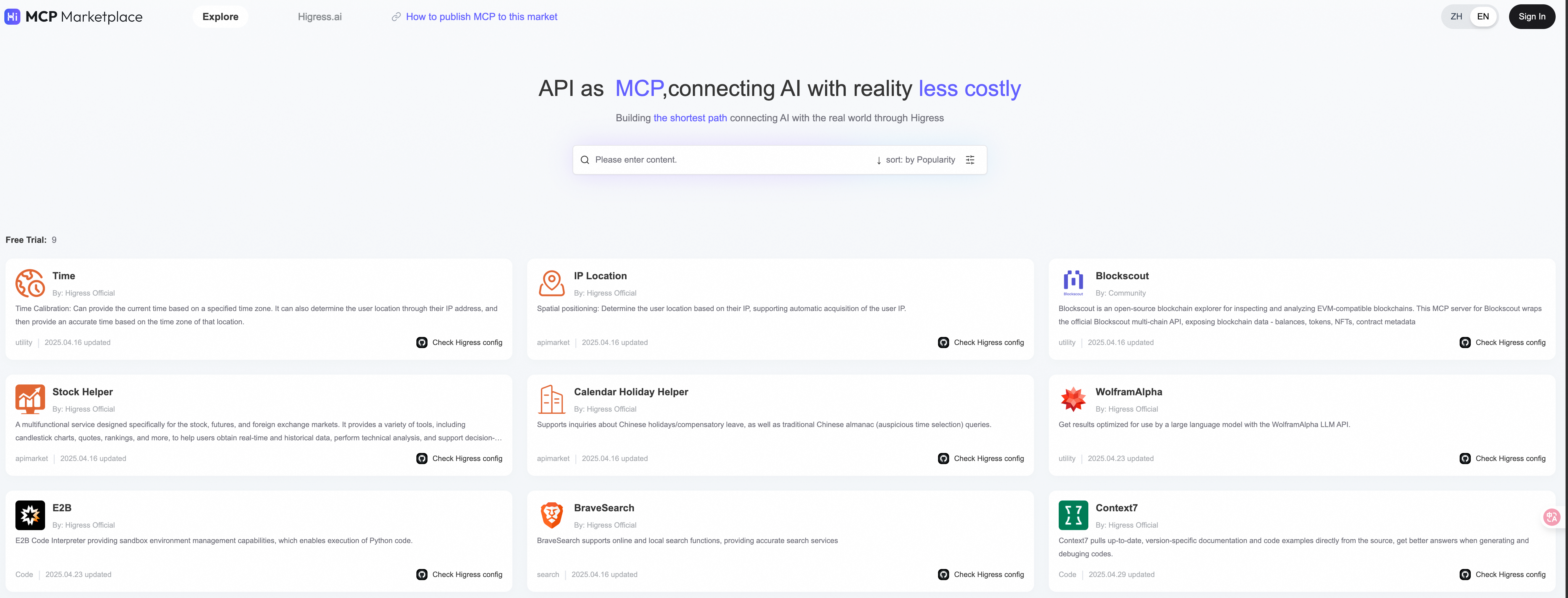 随着 MCP 协议的普及,企业可以以标准化接口将模型与外部工具和服务“即插即用”地连接起来,显著降低对接成本并提升系统的灵活性与可扩展性。在企业侧通过 MCP 市场作为单一入口集中接入与治理 MCP 服务,AI Agent 得以用统一方式高效调用内部系统执行如订单查询、会议室预订等具体任务,同时确保流量治理与弹性扩展的一致性。企业内所有对外部工具的调用请求都必须先通过 HiMarket 进行集中的、标准化的安全管控,包括统一的认证鉴权、精细的速率限制、全面的审计日志等。这种方式避免了在每一个独立的工具服务上重复实现和维护复杂的安全逻辑,极大地简化了 MCP 工具生态的安全治理,为企业构建一个安全、可靠、可控的 AI Agent 体系提供了坚实的基础。HiMarket 可以帮助企业一键拉起私有化的MCP市场,例如 Higress 构建的开源MCP市场:https://mcp.higress.ai/