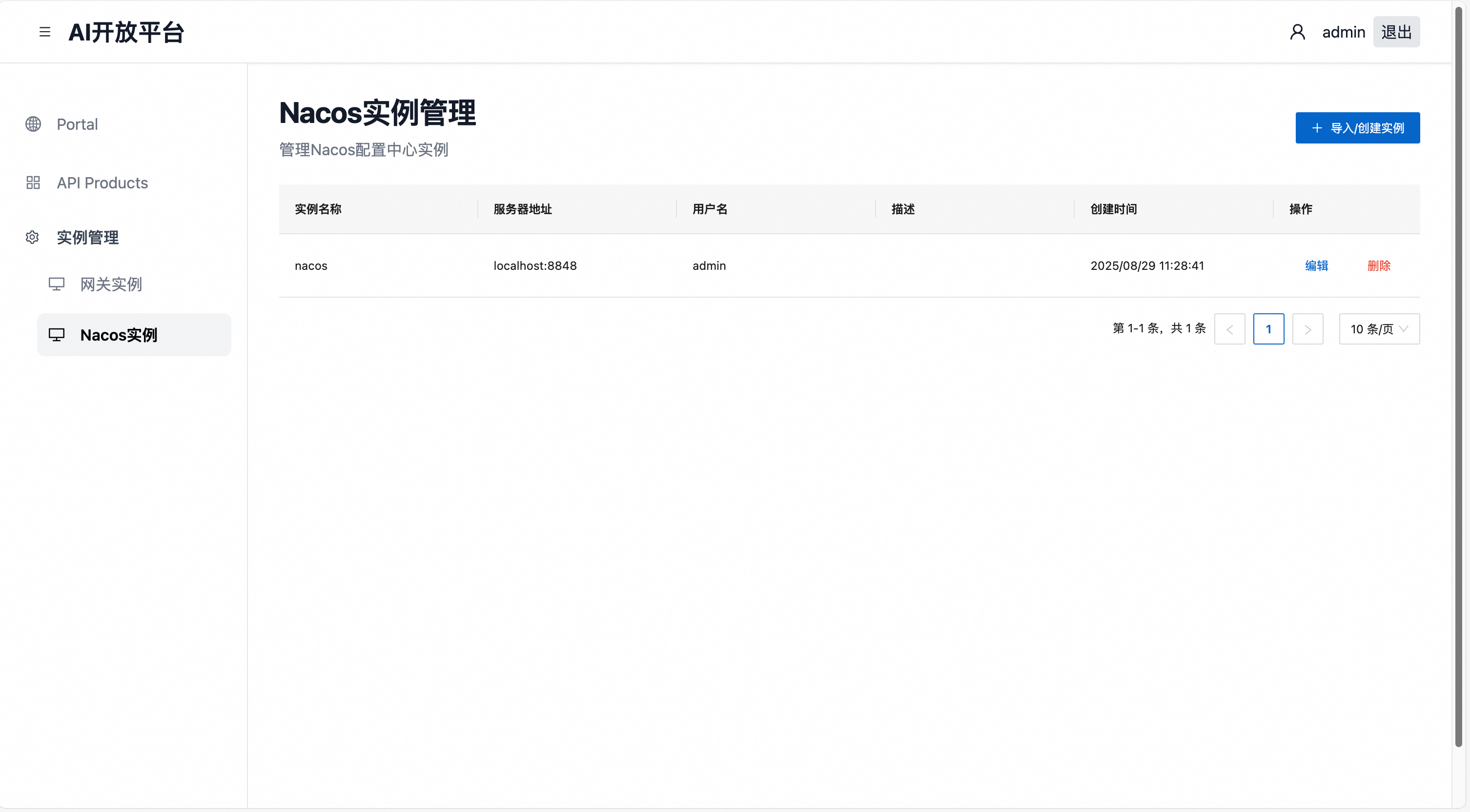 b. 导入Nacos实例:在【实例管理】中,导入 Nacos 。