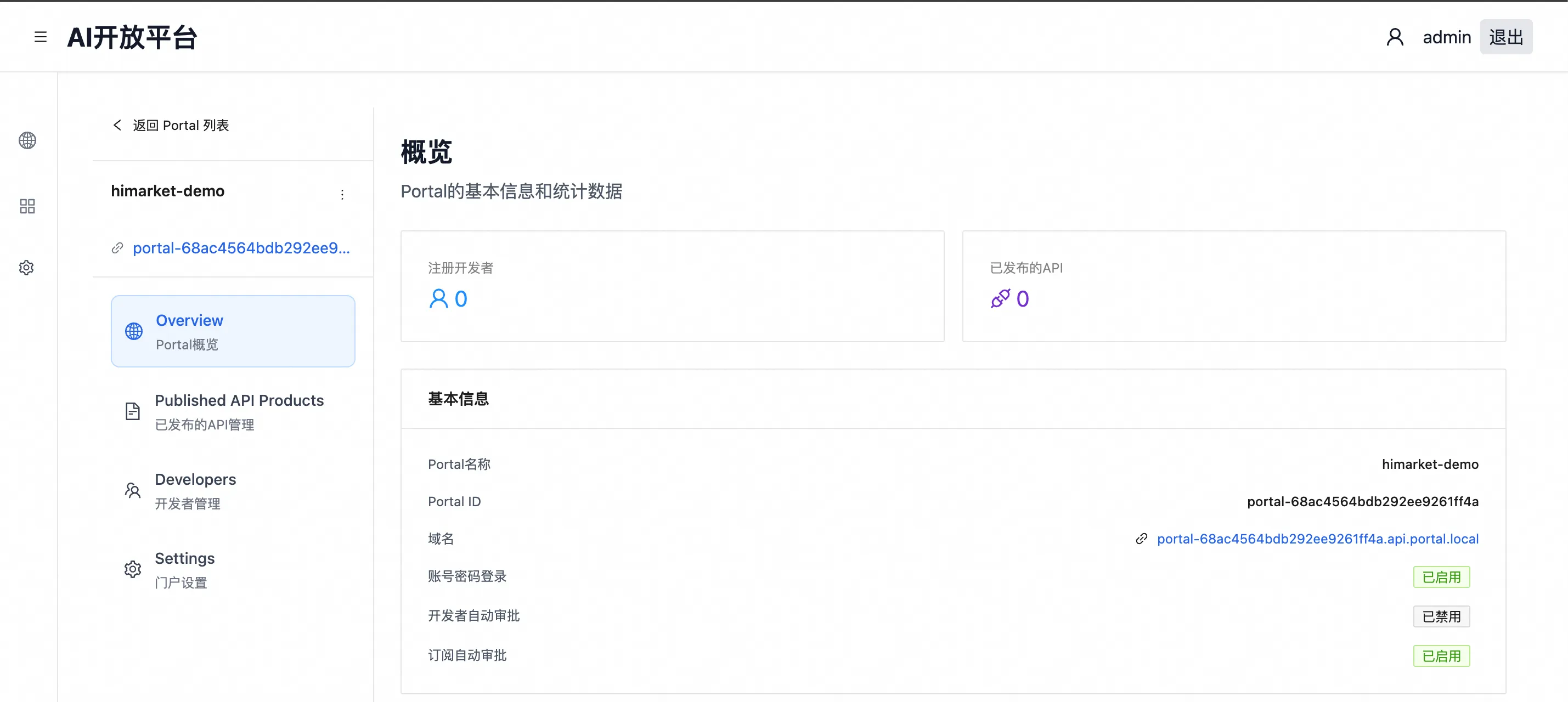 - 创建门户:在【Portal】菜单下,创建一个属于你的 AI 门户,并为其绑定一个用于本地测试的域名(如