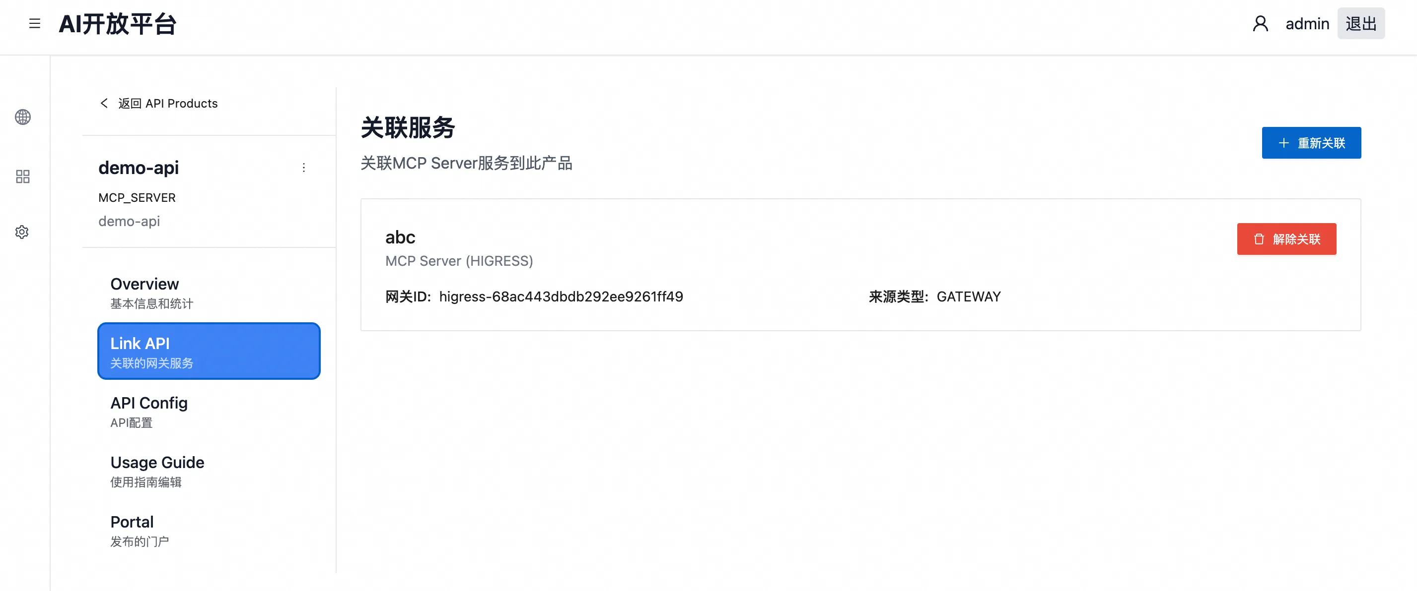 - AI 开放平台管理后台 (for 管理员/运营):在这里将底层的模型服务、MCP Server、Agent 等多样化的 AI 能力,以 API 的形式轻松打包成标准化的“AI 产品”,并配上完善的文档、示例,最终一键发布到门户。