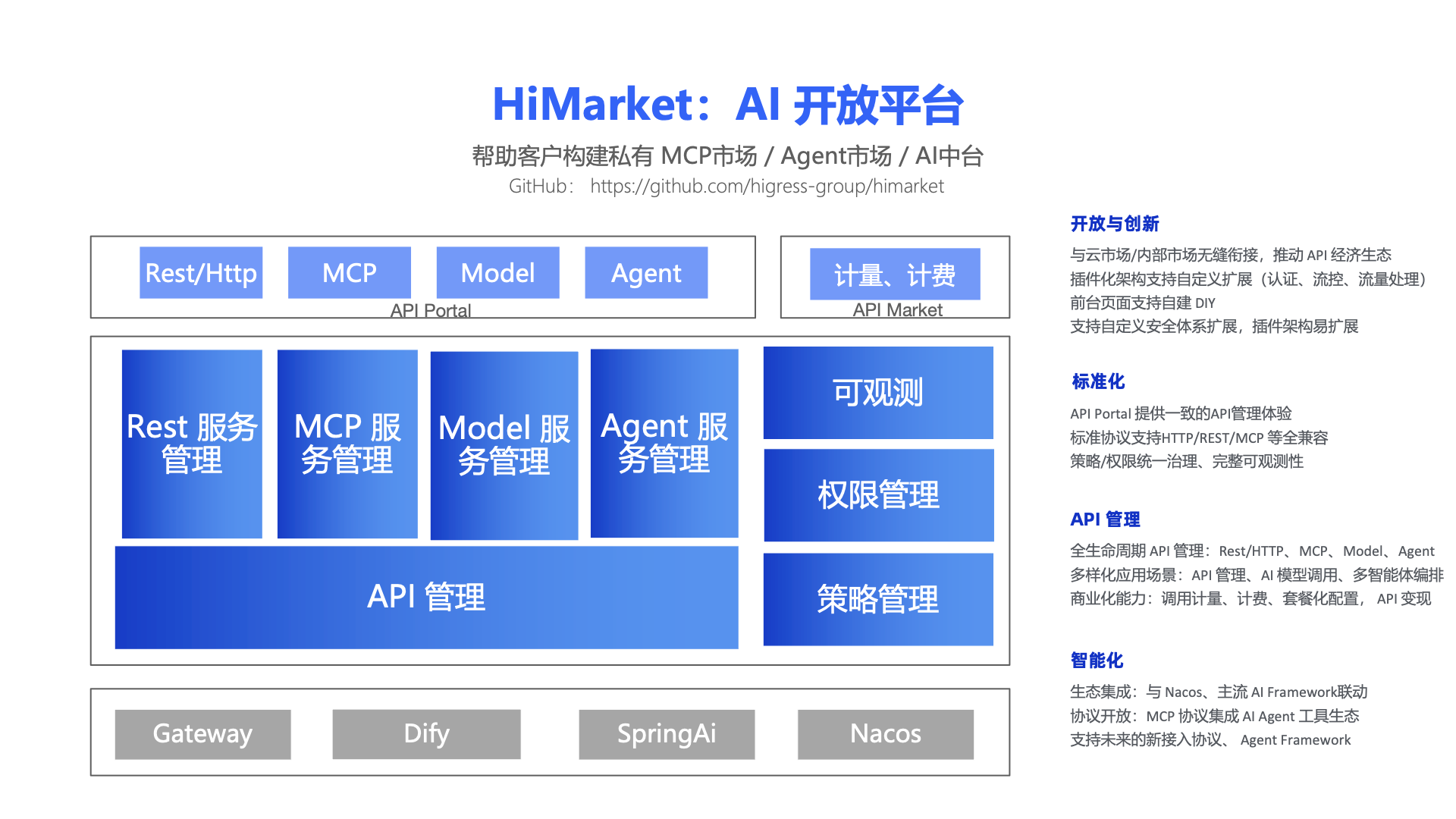 Higress 社区与 Nacos 社区联合推出开源 AI 开放平台 HiMarket,旨在帮助企业快速构建 AI 能力市场。该平台提供管理后台、开发者门户、AI 网关和 Nacos 核心组件,支持企业将 AI 能力产品化,并统一管理开发者生态。