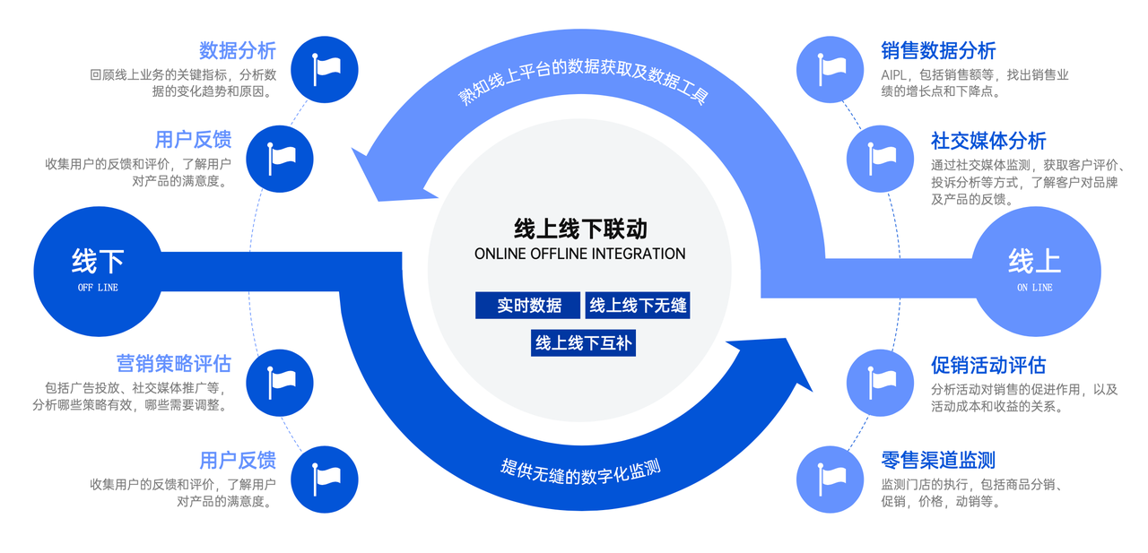 打破线上/线下数据孤岛,电商销售、社媒UGC、线下渠道动销、消费者真实评论全面打通。不仅捕捉购买者,更能分析潜在客群与沉默的大多数,获取360°市场反馈,让线上Marketing品牌动作精准赋能线下Sales转化,实现营销与销售一体化。