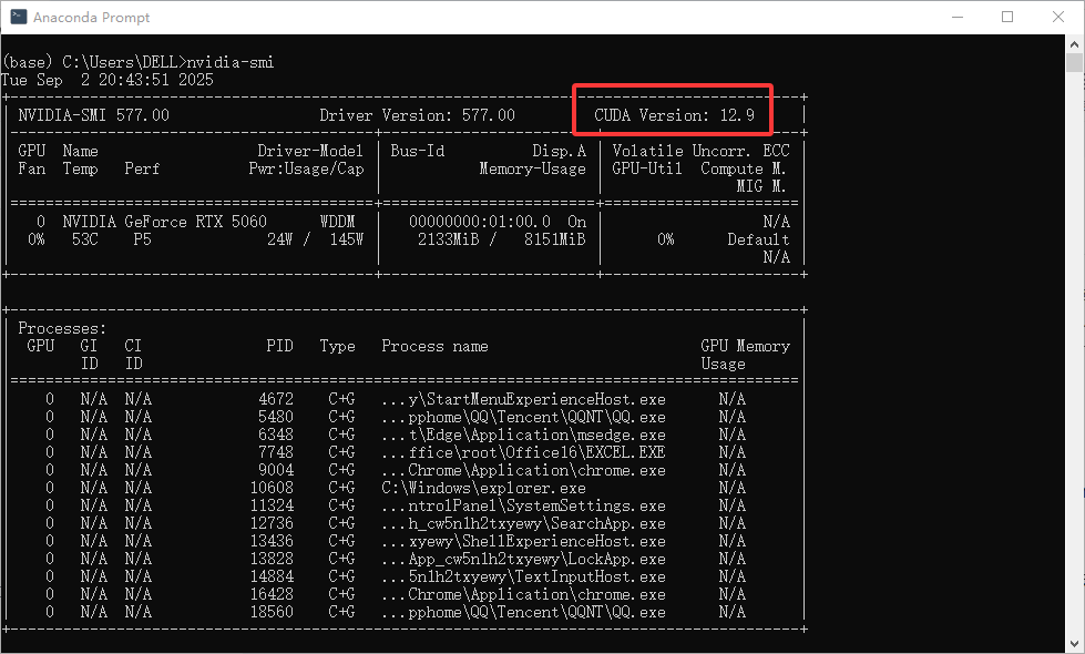 (1)下载cuDNN时要根据CUDA的版本来选择相应的版本。根据已安装的CUDA的版本选择合适的cuDNN版本。前一篇文章我们已安装了CUDA12.9(我们可以在Anaconda自带的Anaconda Prompt输入命令:nvidia-smi 查看CUDA的版本,如下图所示)。因此,在选择cuDNN版本时,可以选择任何一个包含”for CUDA 12.x“字样的选项,并单击“Local Installer for Windows(Zip)”链接下载cuDNN的安装包,如下下图所示: