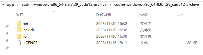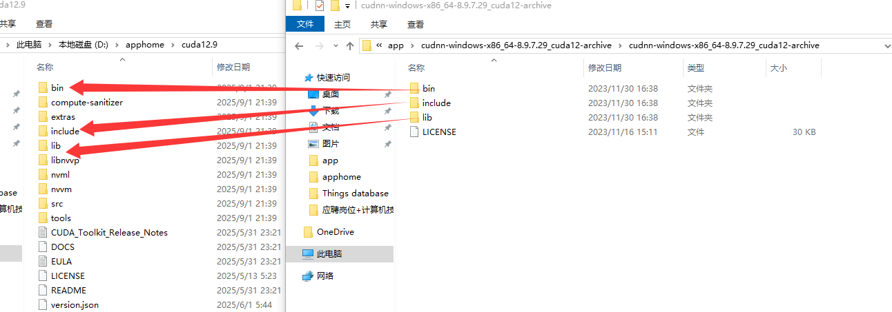 (3)将安装包中的bin文件夹中的所有文件复制到CUDA安装路径【上一篇文章介绍的是如何安装CUDA,安装路径为D:\apphome\cuda12.9】的bin文件夹中;使用同样的方法,依次将安装包中include和lib文件夹中的所有文件分别复制到D:\apphome\cuda12.9路径下的include、lib文件夹中,如图所示,注意:请不要直接复制bin、include和lib文件夹,因为这些同名的文件夹包含的文件不完全相同。