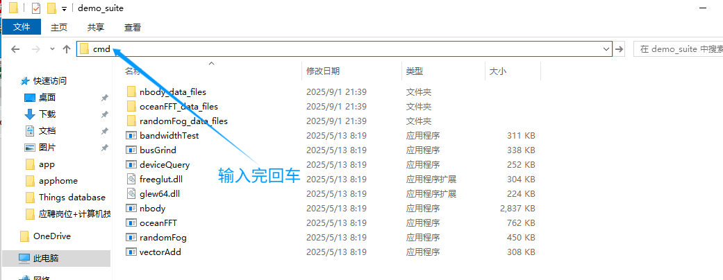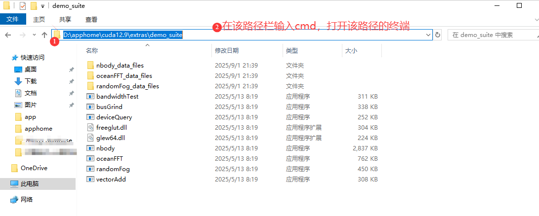 找到目录D:\apphome\cuda12.9\extras\demo_suite,在上面路径栏输入cmd,打开该路径的终端