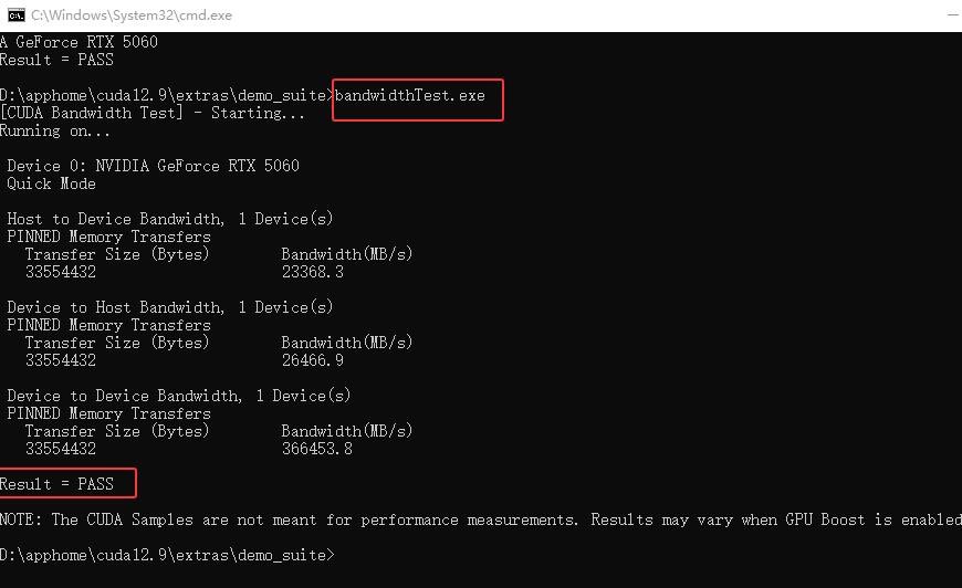 接着运行命令:bandwidthTest.exe,如果出现PASS相关信息表示cuDNN安装成功,测试如图所示:、