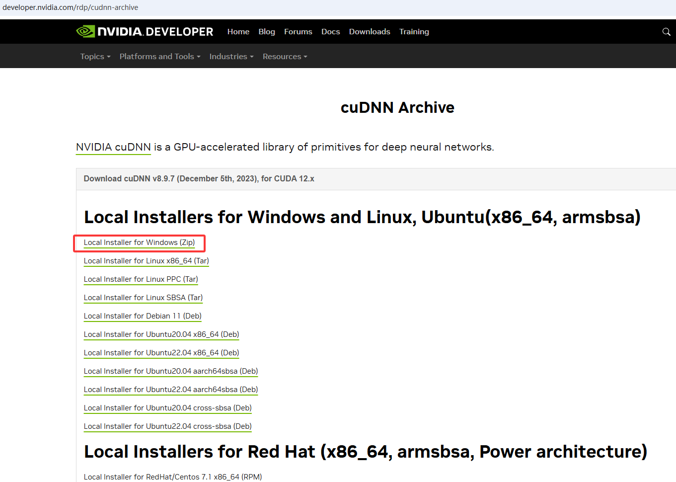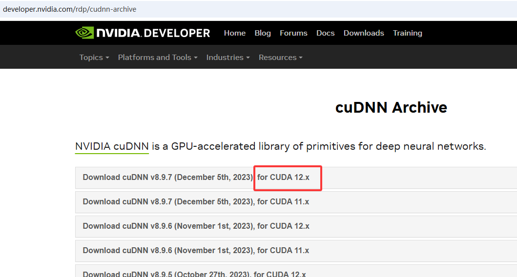 cuDNN的安装包下载网址:cuDNN Archive | NVIDIA Developer