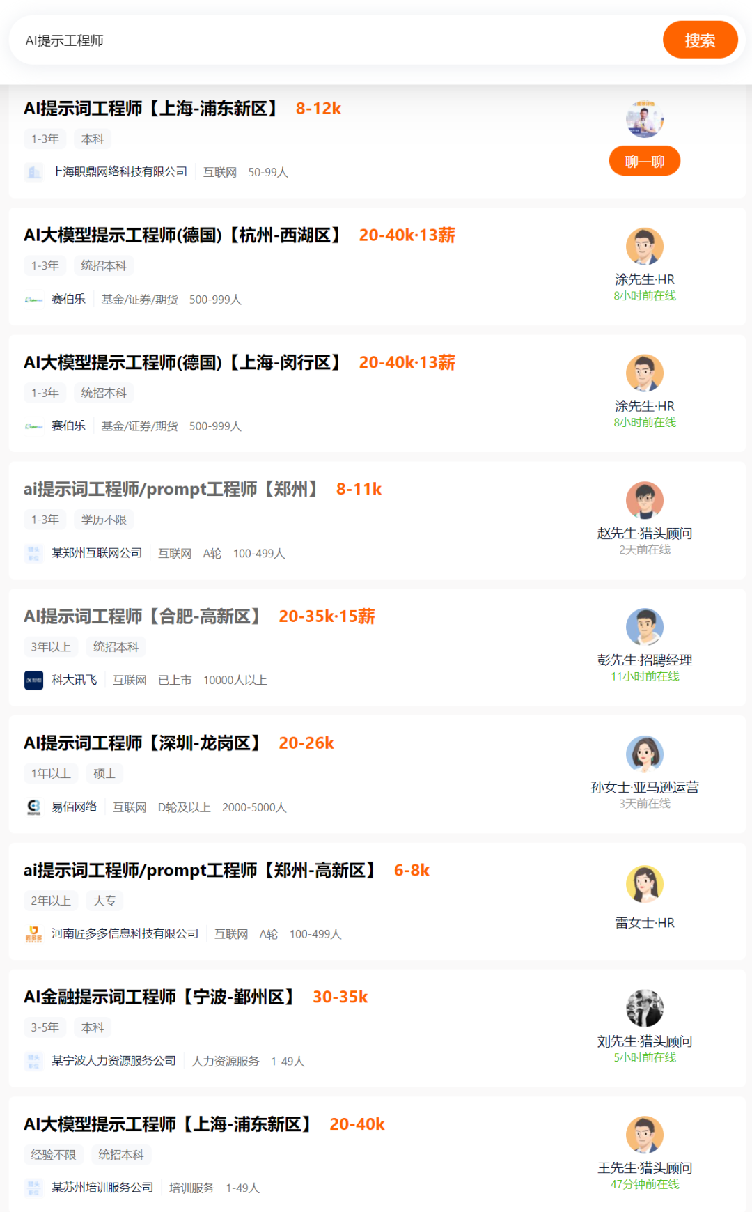 下面是我当前在某招聘网站随机搜索的关于“提示词工程师”职位的一张招聘信息截图,其AI市场需求与薪酬,大家可见一斑:
