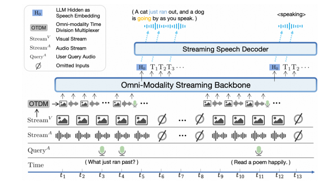 把视觉、音频 chunk 拆成时间片,统一送入 LLM,实现实时多模态推理。