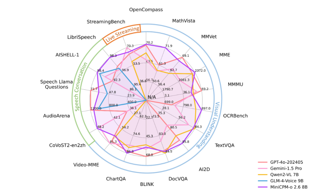 MiniCPM-o 是由 OpenBMB 团队开源的「端侧原生」多模态大模型系列。最新发布的 MiniCPM-o 2.6 仅用 8B 参数 就在 8 项主流基准上追平甚至超越 GPT-4o-202405 等闭源模型;搭配 MiniCPM-V 4.0(4B)更可把延迟压到 iPhone 16 Pro Max 上 2 s 首 token、17+ token/s 解码。