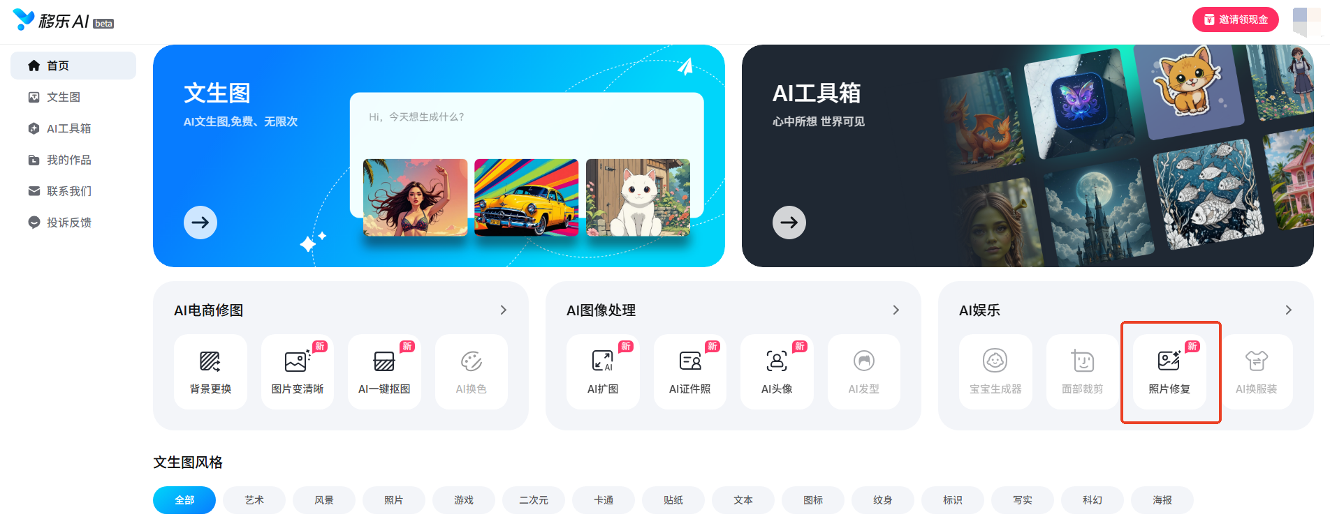 先简单安利一下:移乐AI是一个集合了N种AI黑科技的中文在线工具网站,主打一个“免费无限刷副本”——文生图、背景更换、图片变清晰、AI证件照、一键抠图、扩图……总之,只有你想不到的,没有它不能AI的!