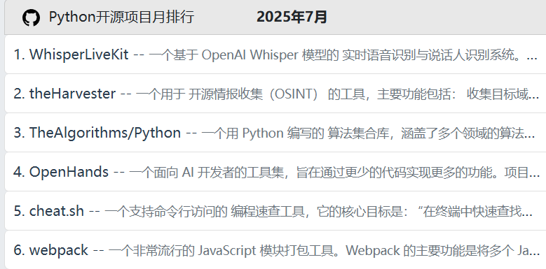 本文摘要介绍了多个开源工具和项目,涵盖AI、开发工具、数据可视化等领域。包括WhisperLiveKit(实时语音识别)、theHarvester(OSINT情报收集)、TheAlgorithms/Python(算法实现库)、OpenHands(AI开发工具集)、cheat.sh(编程速查工具)、webpack(JavaScript打包工具)、ai-hedge-fund(AI量化投资)、matpl