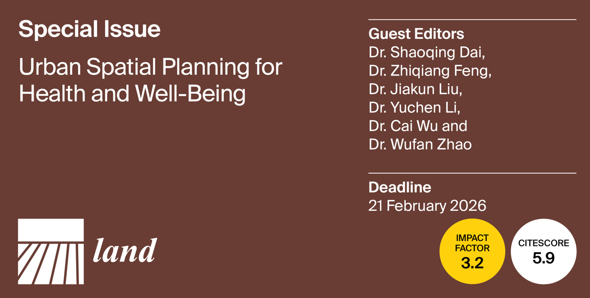 我们在Land上组织了一个专刊,题目为urban spatial planning for health and well-being。欢迎各位专家学者赐稿,投稿日期截止为2026.02.21。