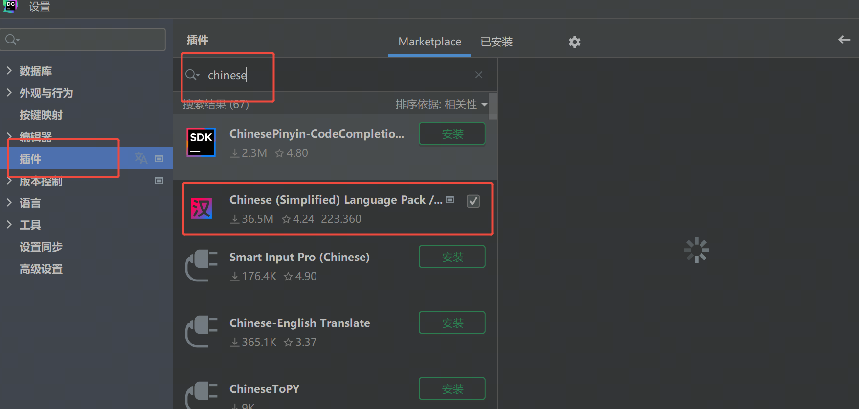 2. 选择plugins 搜索chinese,下载简体中文插件。下载好之后重启datagrip即可。