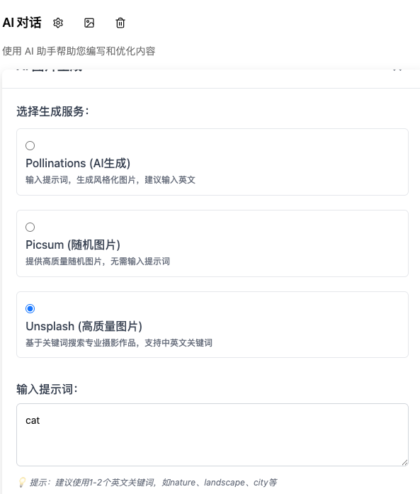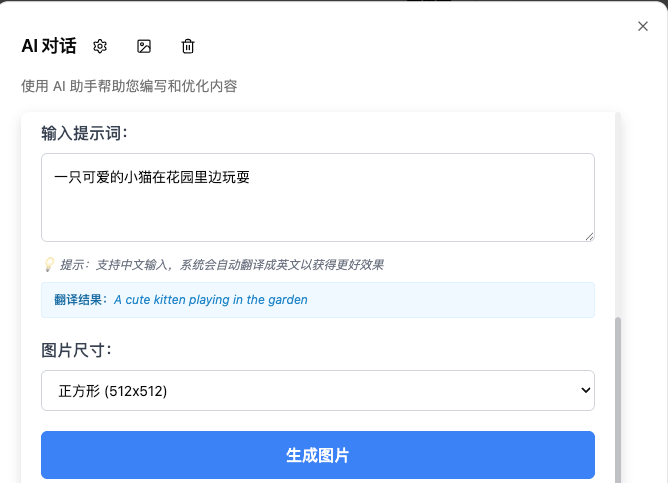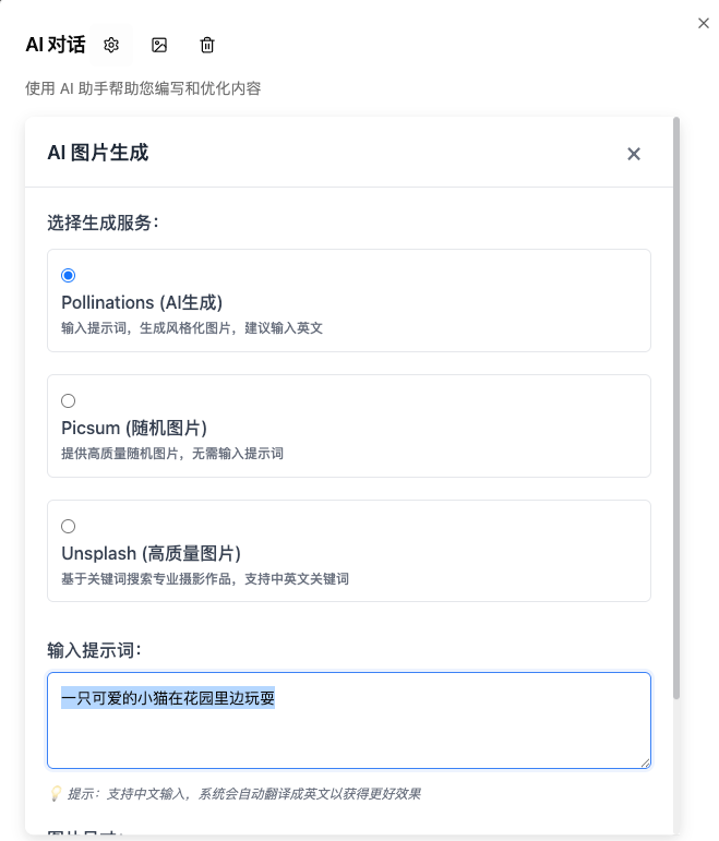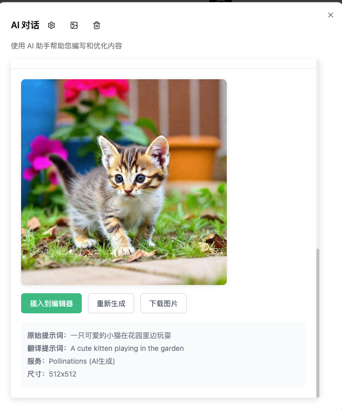 只需要点击插入到编辑区按钮即可,这样图片自动就到编辑区域了,那我们将最后一张猫的照片插入到编辑区之后如下展示:
