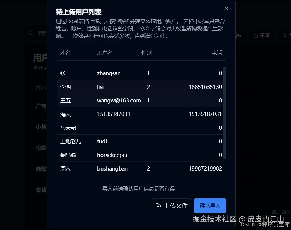 点击上传文件,选择上面的表格进行上传,之后大模型接口会返回解构后的用户队列。 这是大模型识别的结果展示: