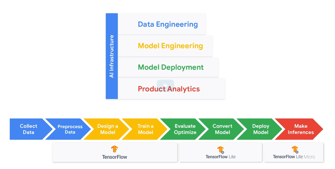 模型训练和部署的过程。然后是四个终端,标准的TensorFlow,TensorFlow Lite,TensorFlow Lite Micro,TensorFlow JS。