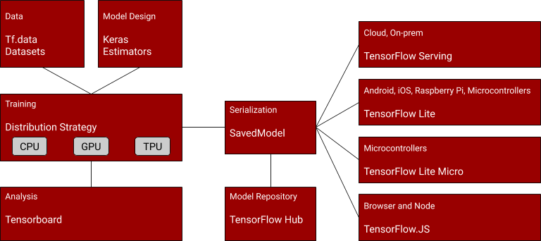 - The standard TensorFlow models that you’ve been creating this far, trained without any post-training modification can be deployed to Cloud or on-Premises infrastructures via a technology called TensorFLow Serving, which can give you a REST interface to the model so inference can be executed on data that’s passed to it, and it returns the results of the inference over HTTP. You can learn more about it at https://www.tensorflow.org/tfx/guide/serving