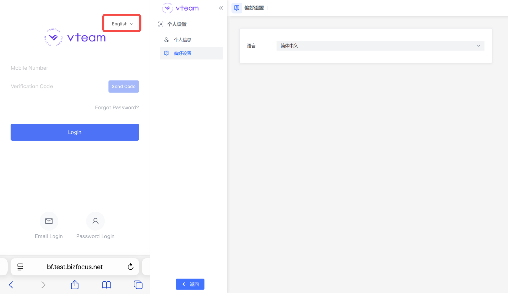 用户也可在 “个人设置 - 偏好设置”(PC 端)或 “我的 - 语言设置”(移动端)手动调整语言,且语言优先级为 “个人语言 > 浏览器语言 > 租户语言”。