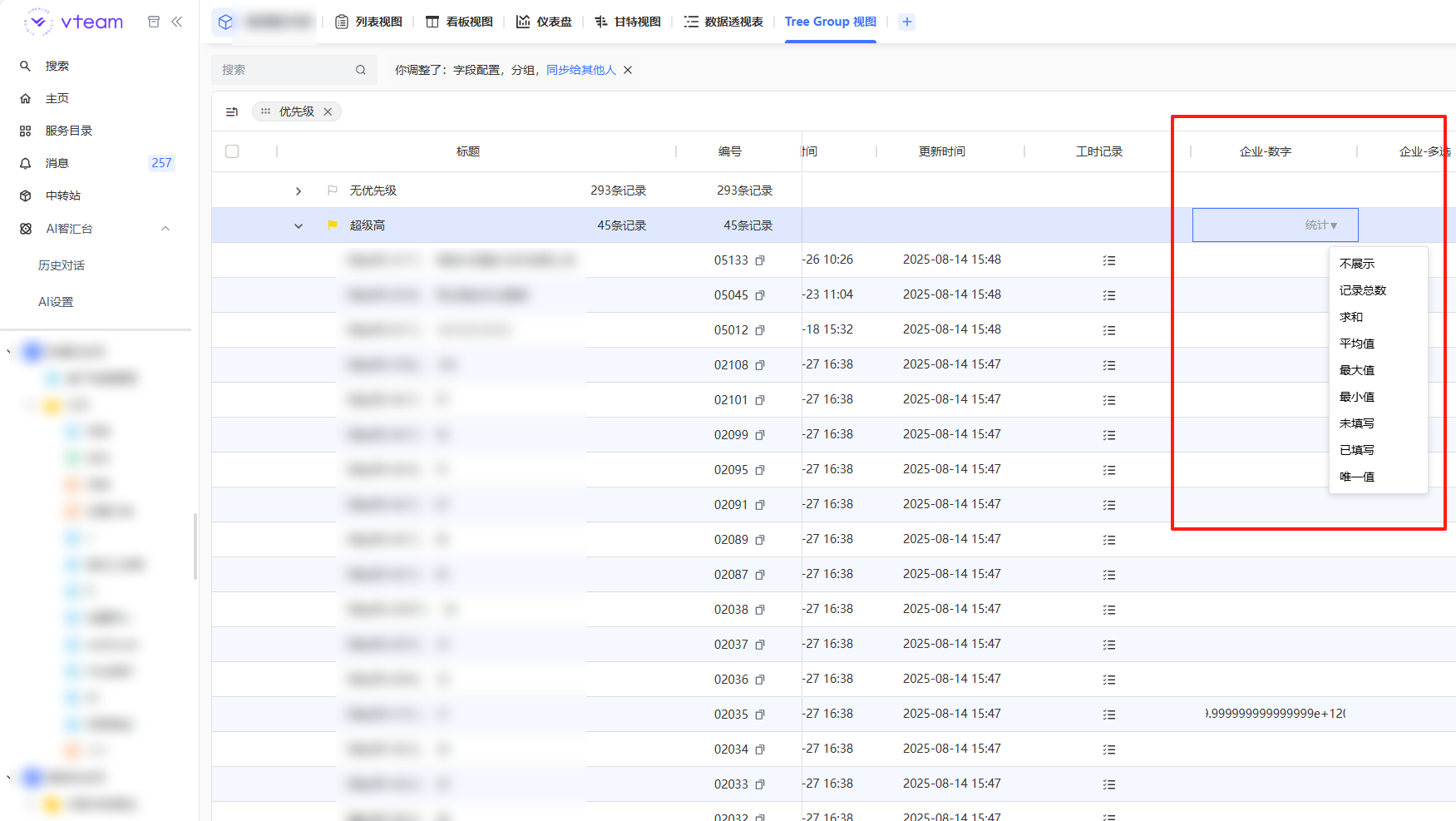在TreeGroup视图上新增分组统计功能,可按字段类型选择统计维度 —— 总和、最大值、最小值,日期类型支持最早时间、最晚时间等,让数据统计更灵活,无需手动核算即可快速获取关键数据结论。