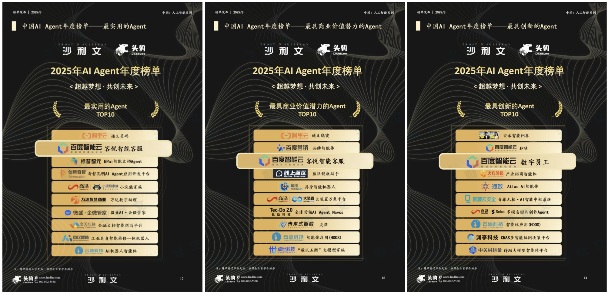 百度智能云客悦成功蝉联「最实用Agent TOP10」与「最具商业价值Agent TOP10」双项大奖,成为唯一连续两年、同时拿下这两大核心奖项的智能客服产品,持续定义行业标杆。