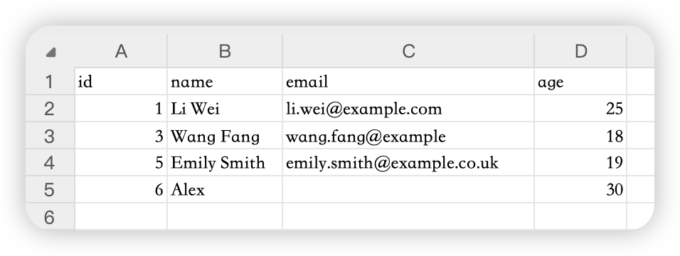 这份JSON一共有6条数据,每条数据都有 id,name,email,age