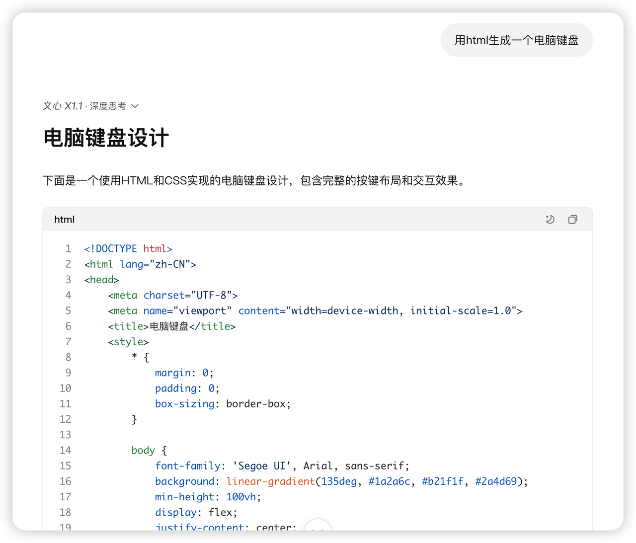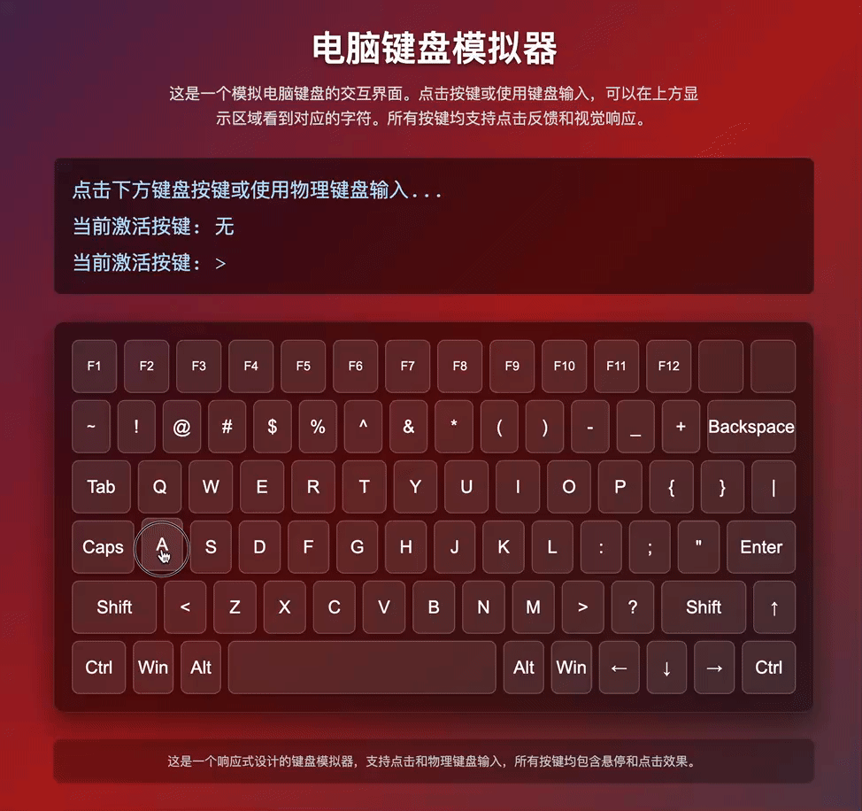 大概花十几秒吧,一个电脑键盘就画出来了,而且还具有交互效果,还能检测到我点击了哪个按键。